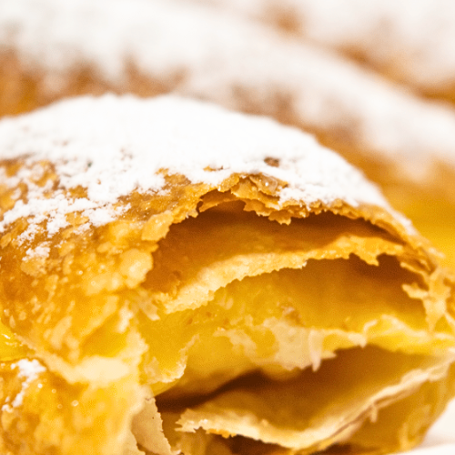 - Abre con cuidado los triángulos de hojaldre y rellena con la crema de limón, dos o tres cucharadas, como más te guste. Ve dejando los triángulos rellenos en la bandeja que vayas a servirlos.